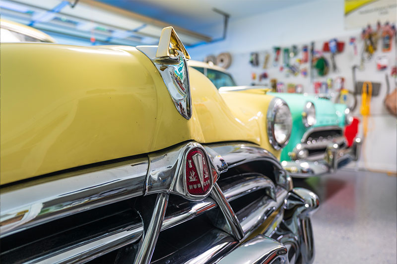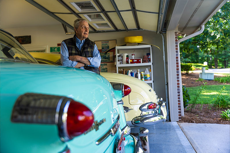 A senrior man stands next to several vintage cars.